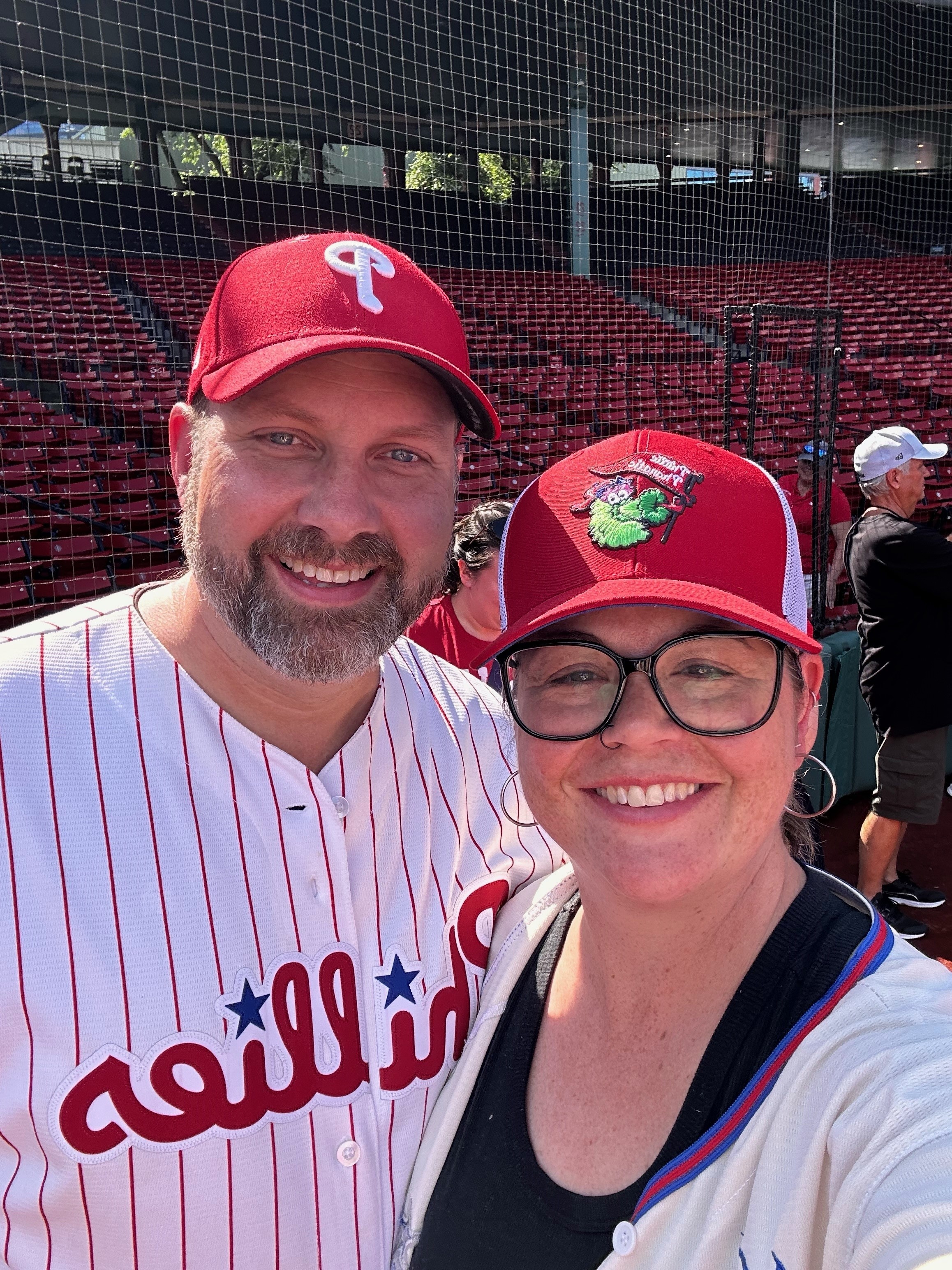 The pregame tour started on the steps of the team store, located across Jersey Street from the ballpark. From there, we walked into the home plate entrance, crossed the concourse, entered the lower-level seating bowl. and proceeded down to field level behind home plate. There we were allowed to stand and watch batting practice for about twenty minutes. Matt Strahm, a Phillies relief pitcher came over and signed autographs while we were there.