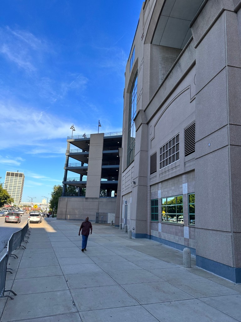 The majority of people approaching from the train station entered the stadium using a pedestrian bridge that connects across West 35th street from an entertainment building that contains a sports apparel store and a dining venue. We didn’t explore this building, opting instead to continue walking around the exterior perimeter of the stadium.